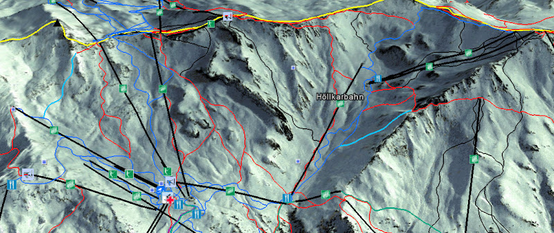 Вот с этим потруднее не могу найти карту схему спусков, так помню что с сантона поднятся наверх выехать, спустится по 17 трасе к автобусной остановке, доехать в зюрц выйти на второй остановке, перейти дорогу а там уже по схеме понятно! Если найду карту то точно опишу по номерам трас